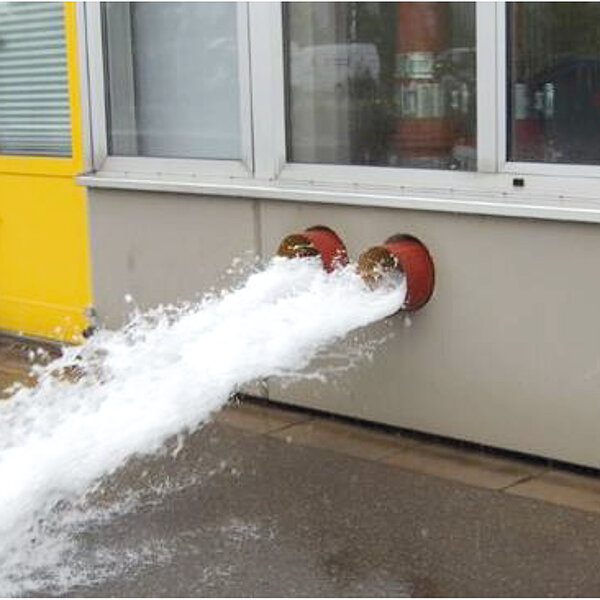 Außerhalb des Gebäudes gilt es, bei der Betrachtung abflusswirksamer Flächen mit den richtigen Regenmengen, im Zweifelsfall mit dem Jahrhundertereignis r(5,100) zu kalkulieren, sollten Gebäude oder Sachwerte gefährdet sein. Wie mit dem Drainagewasser verfahren wird, muss im Einzelfall geklärt werden, da eine Einleitung von Grundwasser in die öffentliche Abwasseranlage grundsätzlich untersagt ist. Sollte die Ableitung in Ausnahmefällen dennoch genehmigt werden, ist das Drainagewasser rückstaufrei in den Kanal einzuleiten. In Verbindung mit den dann einzusetzenden Pumpen gelten spezielle Anforderungen an die Schachtgestaltung. Zum Schutz der Pumpenaggregate soll in den besteigbaren Schacht (mind. ᴓ 1000 mm) ein 0,5 m tiefer Sandfang eingebaut werden. Entsprechend der Vorschrift, dass bei unkontrollierbarem Zufluss eine Doppelanlage vorzusehen ist, lässt sich die Anforderung an eine zweite Pumpe in diesem Fall, ohne konkrete Nennung, ableiten. Ebenfalls möglich sind speziell konzipierte Drainagepumpen, die bereits in Schächten mit einem Durchmesser von 300 mm zuverlässig arbeiten, bei sicherer Gewährleistung des Schaltbetriebs.