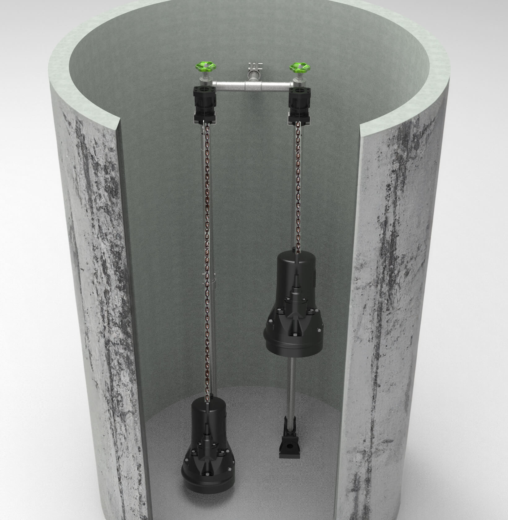 Not only these components are exposed to aggressive environmental influences, but also the pump itself is often affected. Hydrogen sulfide (H2S), which can form in wastewater during long periods of standing, leads to the formation of sulfuric acid. This acid causes metal parts of pumps and fittings to corrode and also affects concrete sumps. Sand and other sediments in the wastewater lead to erosion and wear of the components. Also, pump vibration can cause joints to leak and pumps to operate inefficiently. Without regular maintenance of the pump and its mounting equipment, minor problems can become major ones and complete failure is imminent. Biological growth on the components and permanent temperature fluctuations within the sump structure are additional influencing factors.